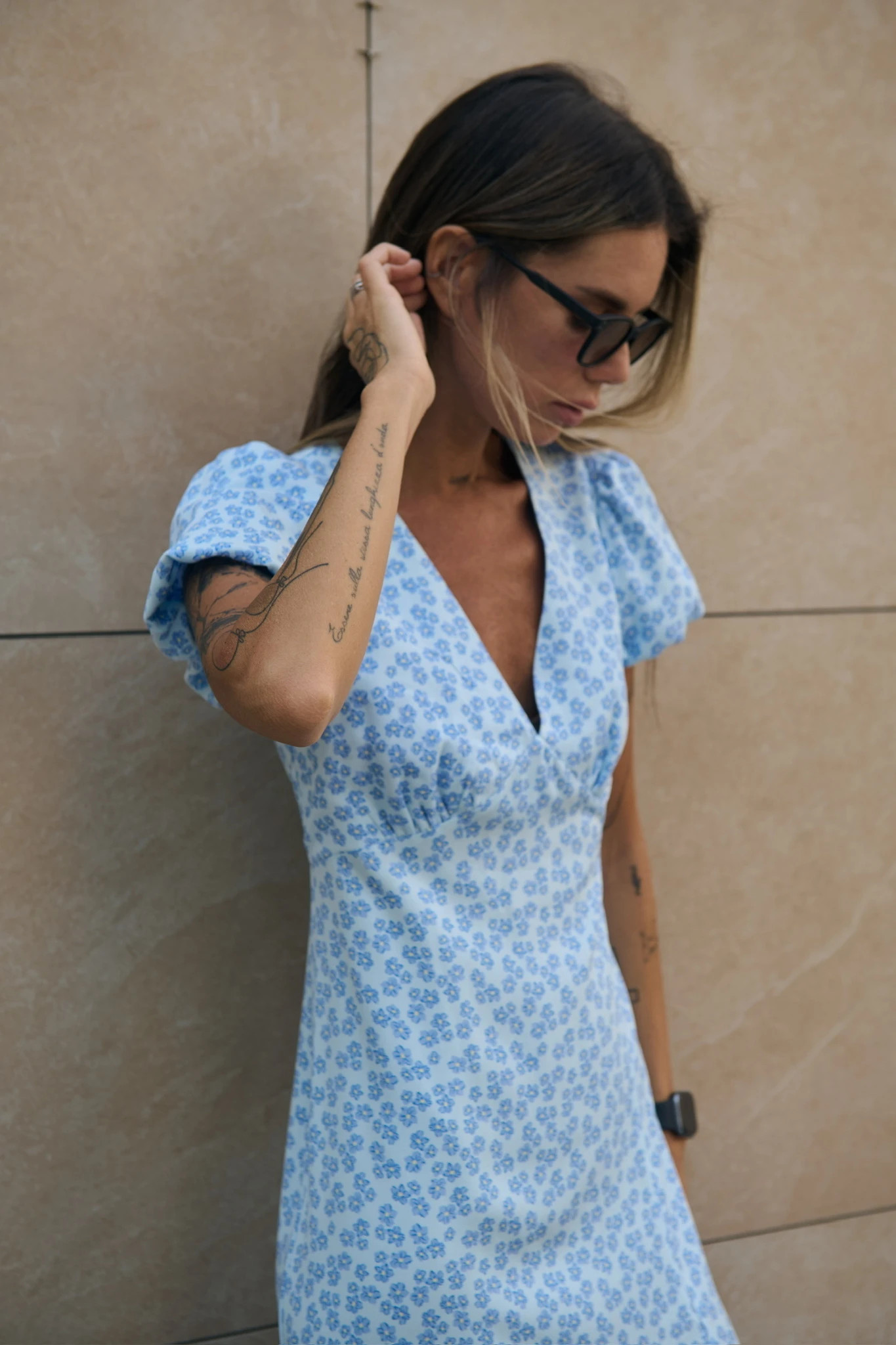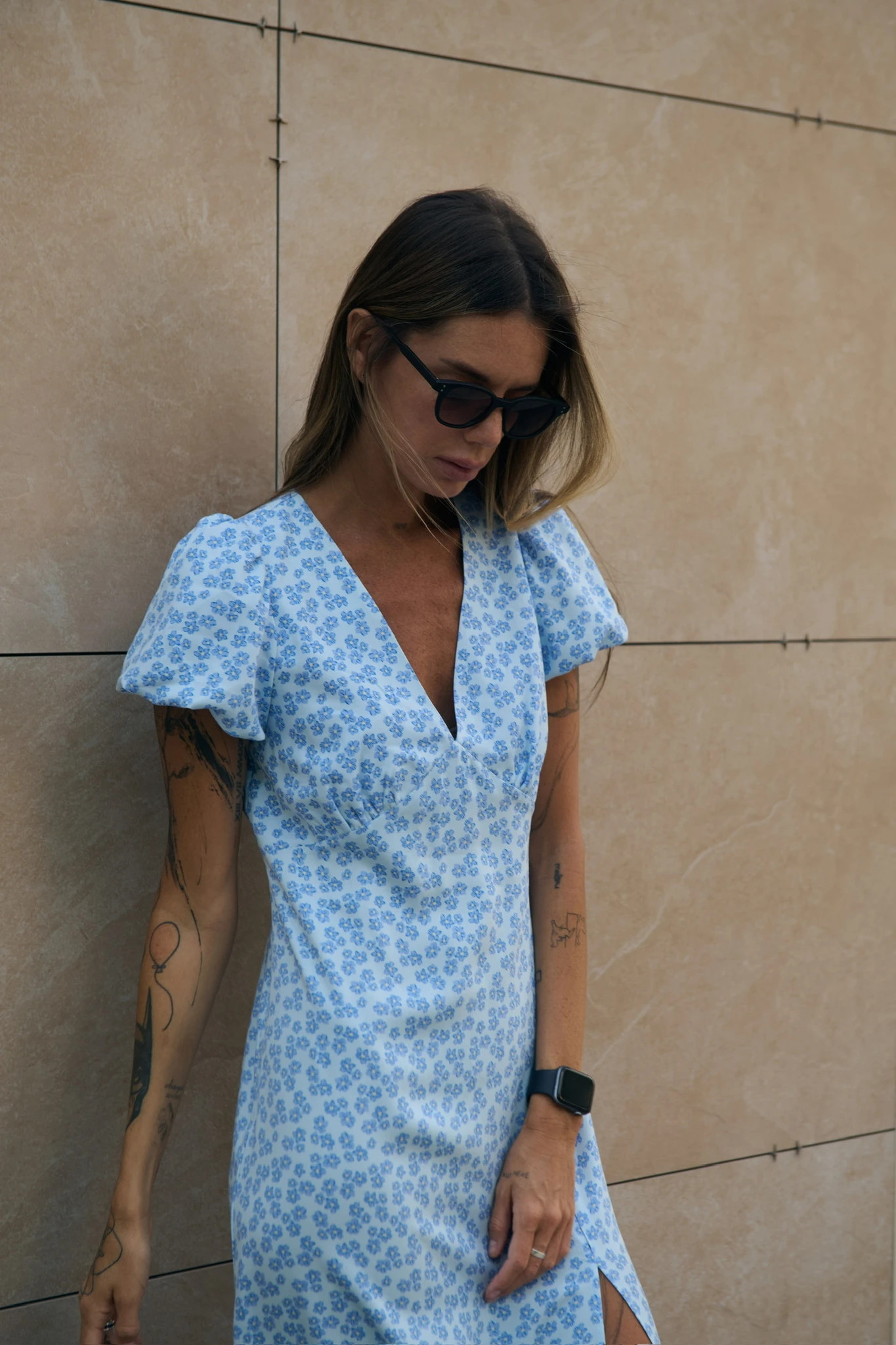 Платье миди с разрезом из вискозы, голубой (принт:цветы)